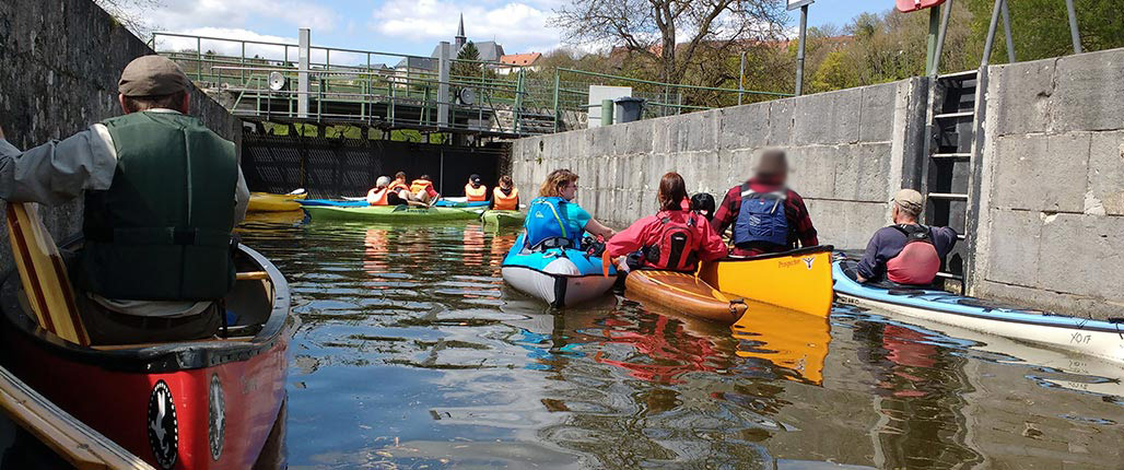 Das Wetter des ersten Tages war durchwachsen, Sonne und Wolken wechselten sich ab, aber es war nicht kalt. Die Schleusen sorgten auch bei den kleineren Paddlern für Abwechslung. Trotzdem war die Fahrt nach Leun für den Einen anstrengender als für den Anderen. Die Nacht war überraschend kalt und so zeigte sich morgens die Zeltwiese in frischem weiß. Dabei war der Sonntag als richtiger Vorsommertag angekündigt worden. Zeit zum Bräunen gab es allerdings genug denn den ganzen Tag schien die Sonne. Von Leun ging es weiter bis nach Weilburg. Unterwegs konnte man die Seele bei einem Kaffee und Kuchen baumeln lassen, denn dies gab es direkt an der Schleuse Löhnberg.